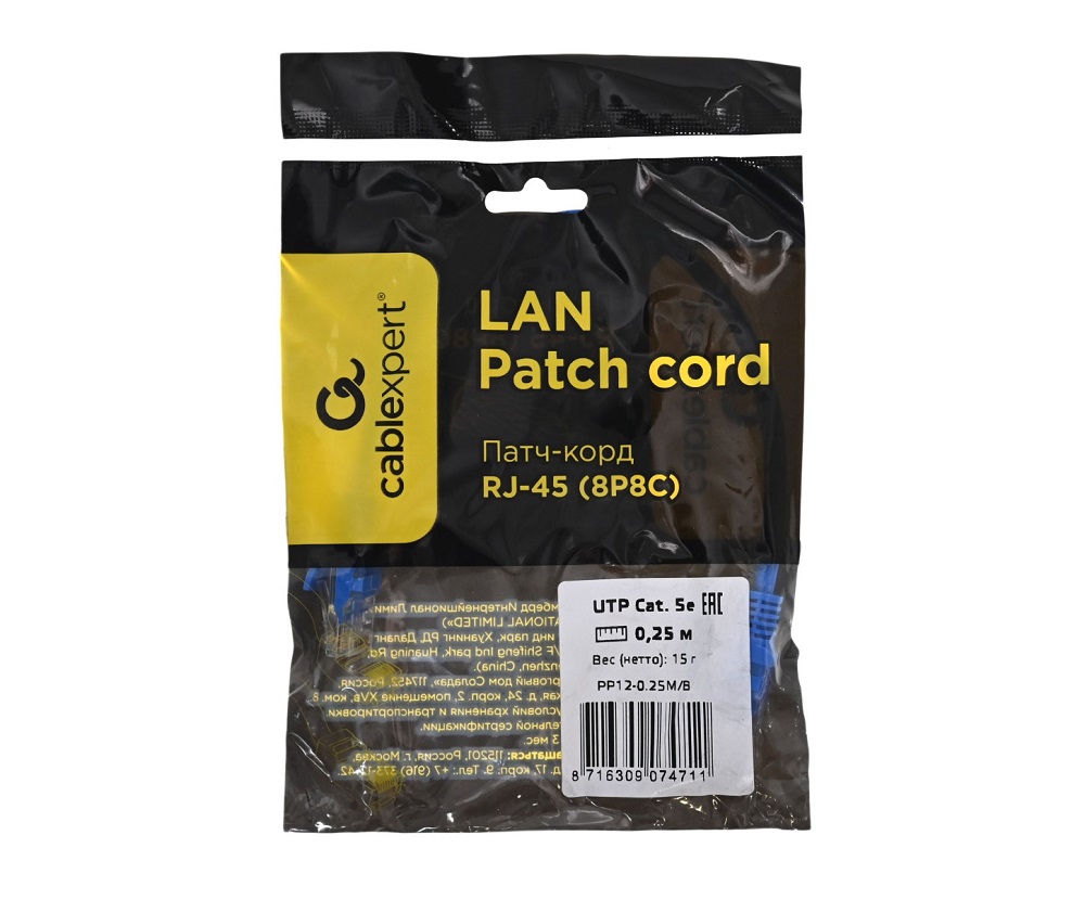 —Патч-корд UTP Cablexpert кат.5e PP12-0.25M/B, 0.25м, литой, многожильный (синий)