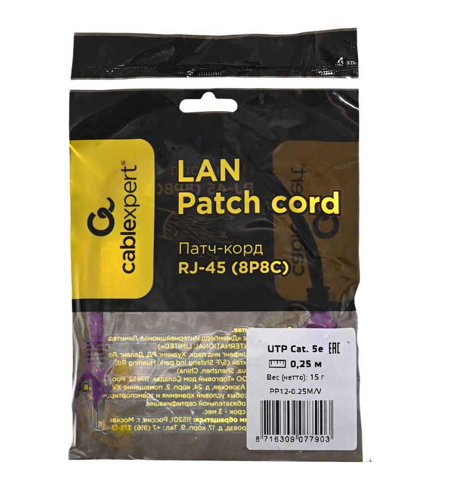 —Патч-корд UTP Cablexpert PP12-0.25M/V кат.5e, 0.25м, литой, многожильный (фиолетовый)