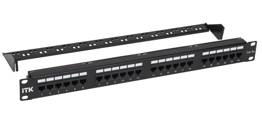 Патч-панель 19" (1U), 24 порта RJ-45, кат. 5e, Dual IDC, с задним кабельным органайзером, 44.5х482х121 мм.