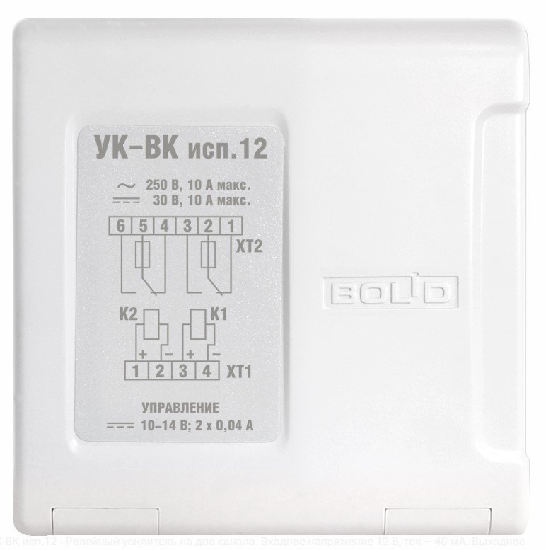 Устройство коммутационное; 2 реле, контакты на переключение; U-упр.12 В; I-упр.40 мА; U-коммут. до 250 В; I-коммут.до 10 А; IP30; t-раб.-30...+50°С; 102х107х39 мм. На DIN рейку.