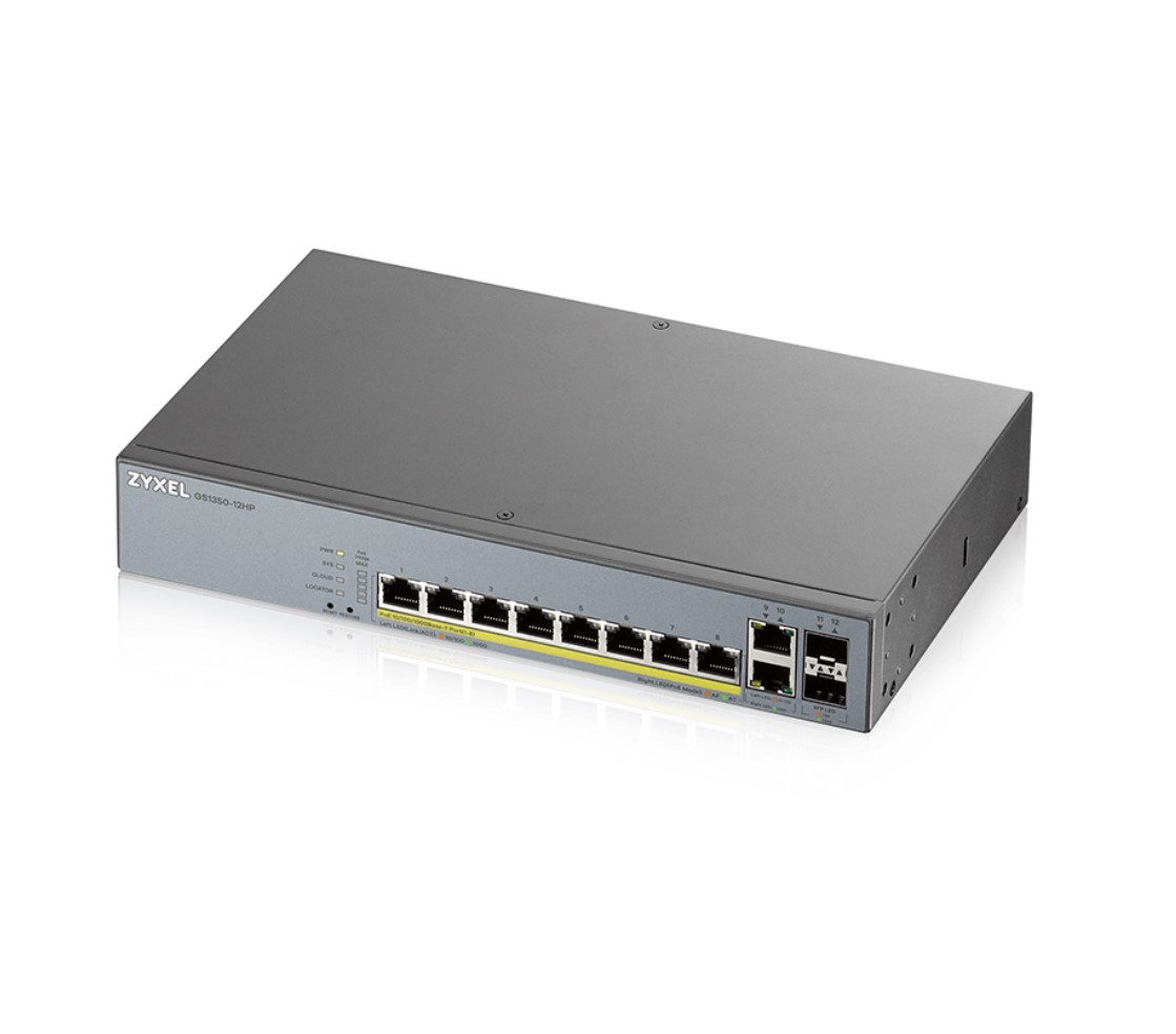 —L2 коммутатор PoE+ для IP-видеокамер Zyxel GS1350-12HP, 10xGE (8xPoE+), 2xSFP, бюджет PoE 130 Вт, да