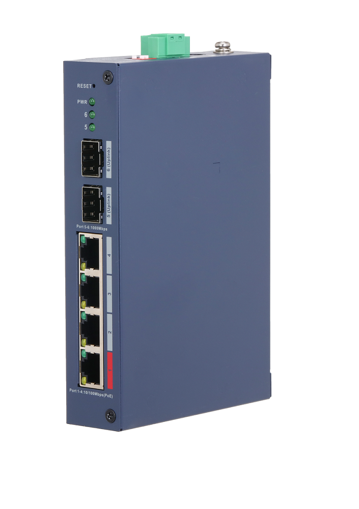 Порты: 4 RJ45 10/100Мбит/с (PoE/PoE+/Hi-PoE), 2 SFP 1000Мбит/с (uplink); мощность PoE: порт 1 до 90Вт, порты 2~4 до 30Вт, суммарно до 90Вт; PoE watchdog, передача до 250м; питание: 48~57В(DC); грозозащита: до 6кВ; рабочая температура: -30°С~+65°С; IP30, IK06; монтаж на DIN-рейку.