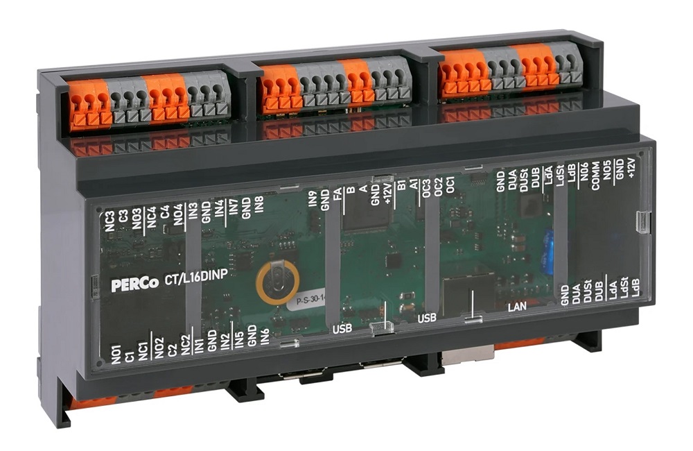 Универсальный контроллер CT/L16DINP предназначен для управления исполнительными устройствами: шлагбаумами, турникетами, замками. Работает в составе систем PERCo.