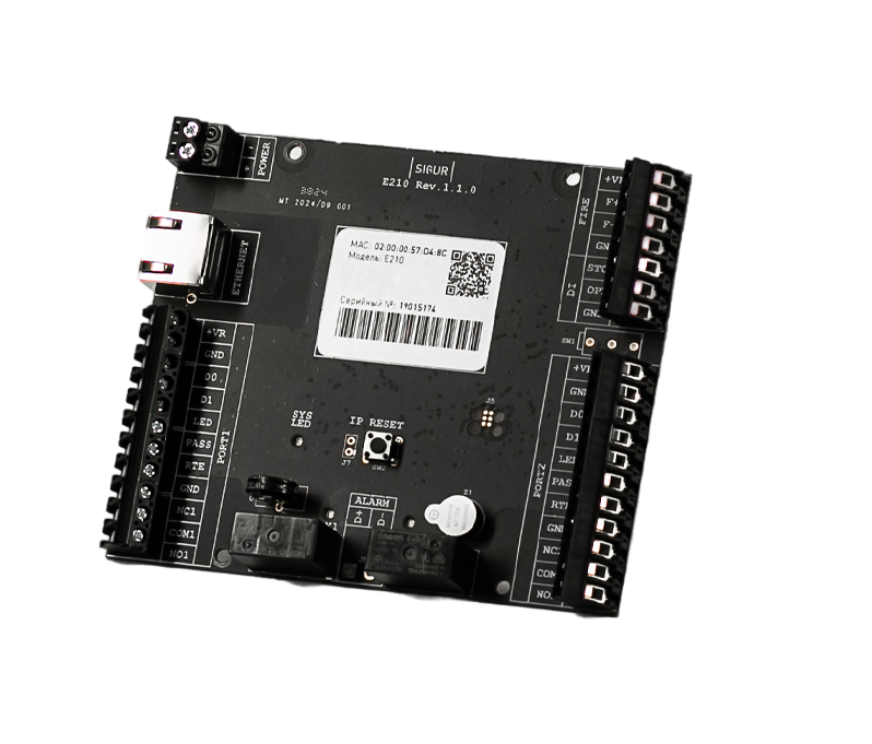 Sigur E210 EMB – базовая комплектация контроллера E210, предназначена для управления дверьми и турникетами. Возможно одновременное управление 2 точками прохода.